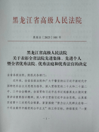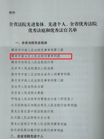 近日,黑龙江省高级人民法院印发了《关于表彰全省法院先进集体、先进个人暨全省优秀法院、优秀法庭和优秀法官的决定》。其中,鹤岗市南山区人民法院刑事审判庭荣获全省法院先进集体。