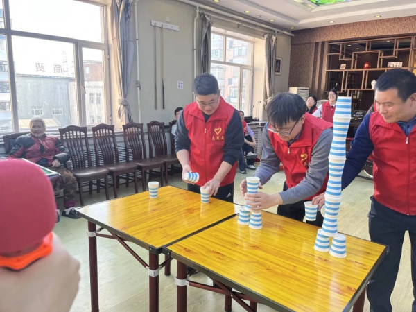 饺子下锅间隙,趣味游戏环节拉开序幕。志愿者们精心设计了“你比划我猜”、“纸杯叠叠乐”等温和有趣的游戏。现场掌声、欢呼声此起彼伏。对于行动不便的老人,志愿者们主动上前陪伴聊天,倾听他们的心声,详细询问生活起居与健康状况。随后的文艺表演更是将活动推向高潮。一个个精彩节目轮番上演,养老院里洋溢着温馨祥和的氛围。